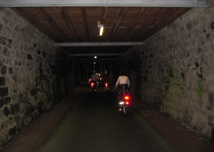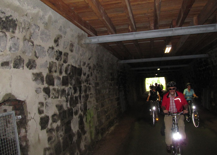 Gemeinsam in der Natur, aktiv und gesellig eine neue Region erfahren. Die Kreisstadt Daun in der Vulkaneifel war Ausgangspunkt unserer 3-tägigen begleiteten Radreise. Die alte Bahntrasse führt von hier gut geteert durch wunderschöne Landschaftsgebiete und beleuchtete Tunnel. Gepflegte Rastplätze, unzählige Aussichtspunkte und die einheimische Gastronomie laden zum Verweilen oder Picknicken ein. Der heutige Mare-Mosel-Radweg ist mit einer Gesamtlänge von 55 Kilometern und einer maximalen Steigung von 3% sehr gut für Gruppen und Senioren geeignet. Kleines Highlight am Ende der ersten Tagesetappe: Im Städtchen Mühlheim konnten wir die Fahrräder in einer Industriehalle sicher unter Verschluss abstellen und der Firmeninhaber stellte uns sogar genügend Steckdosen zum Aufladen der Elektrofahrräder bereit.